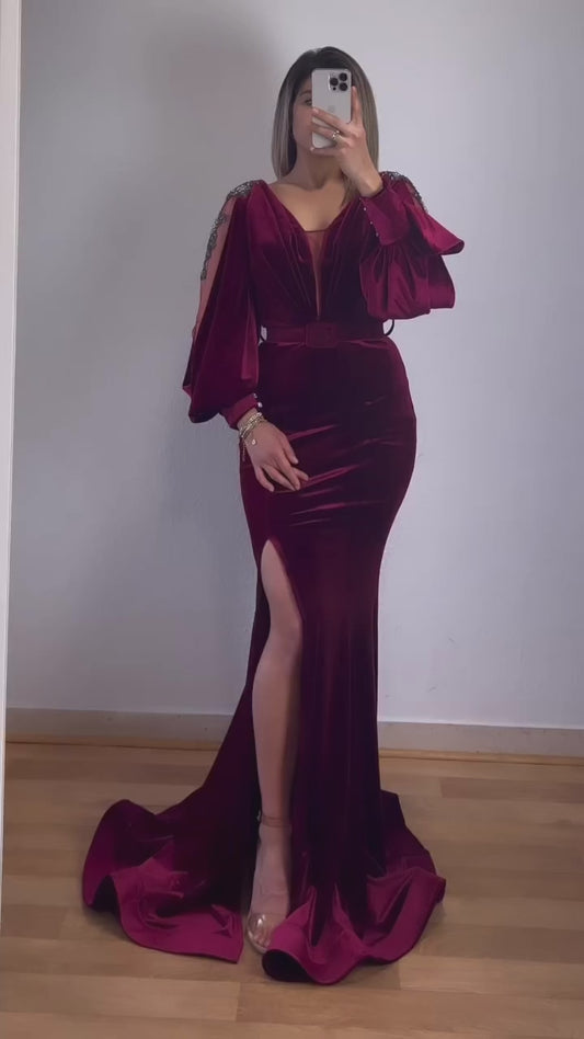 Samtkleid mit Armverzierungen