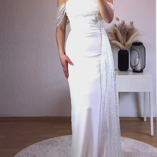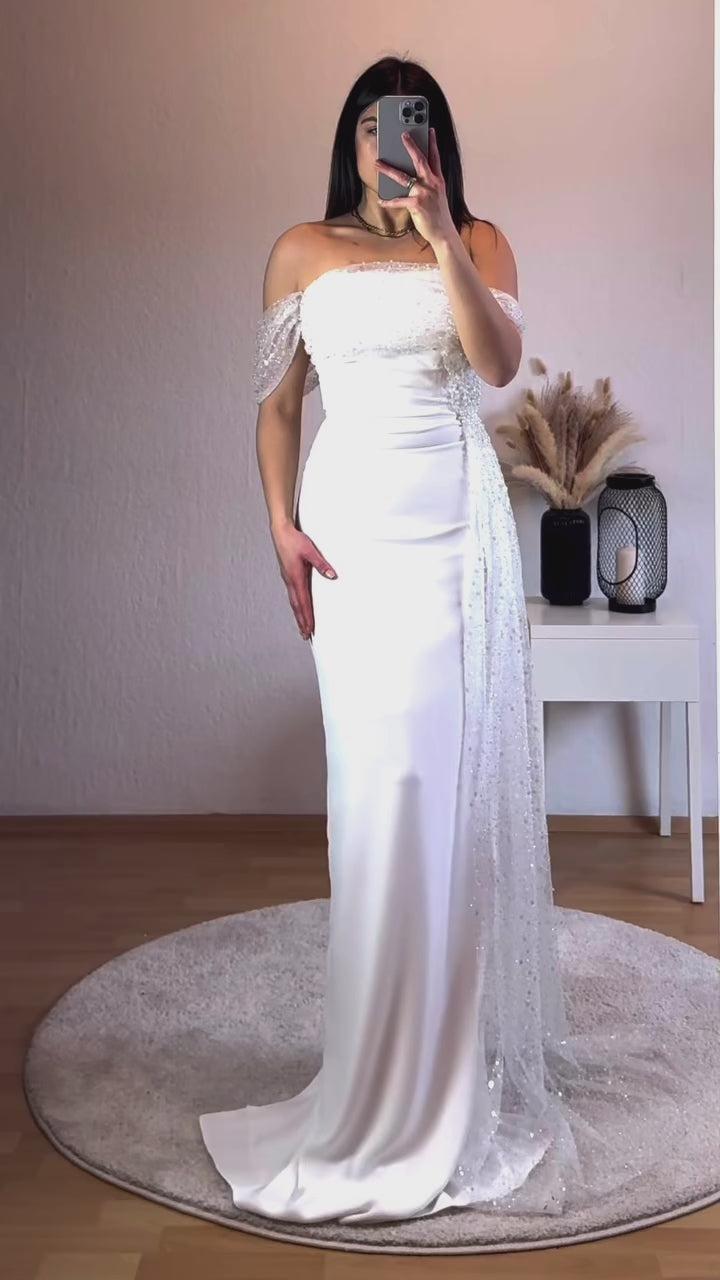 Offshoulder Kleid mit Perlenschleppe