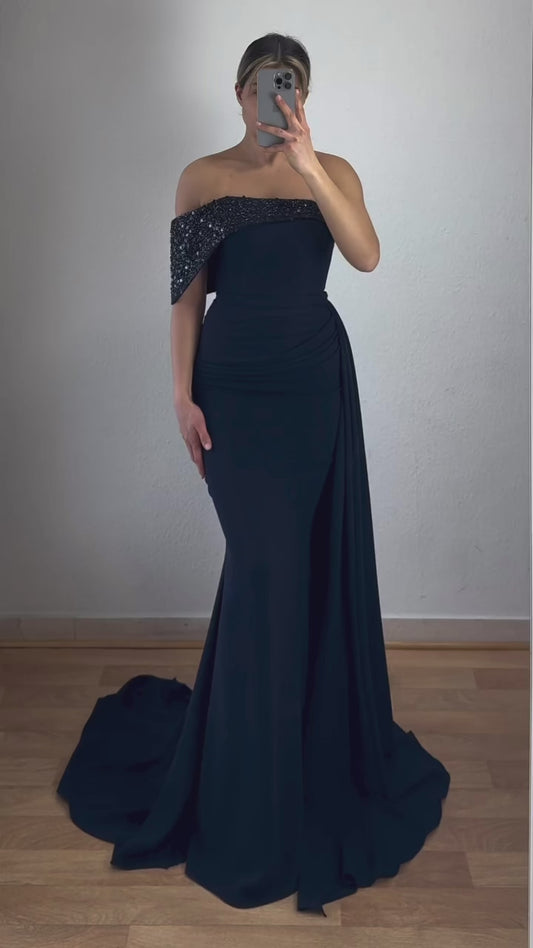 Offshoulder Kleid mit Perlenschleppe
