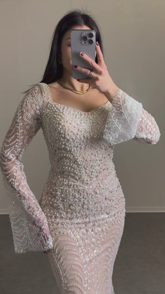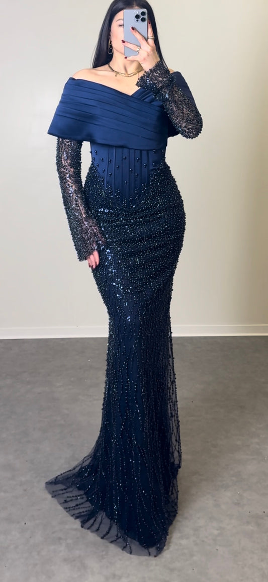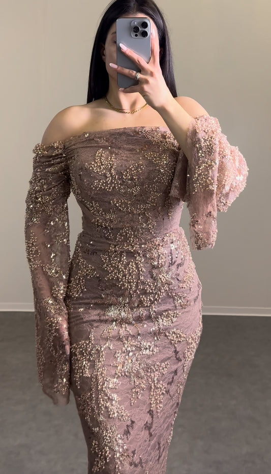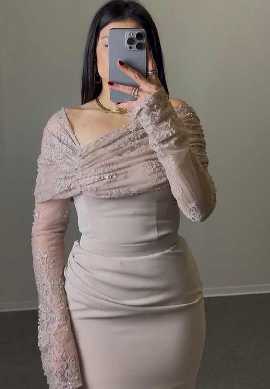 Off-Shoulder Maxikleid mit Spitze- und Perlendetails