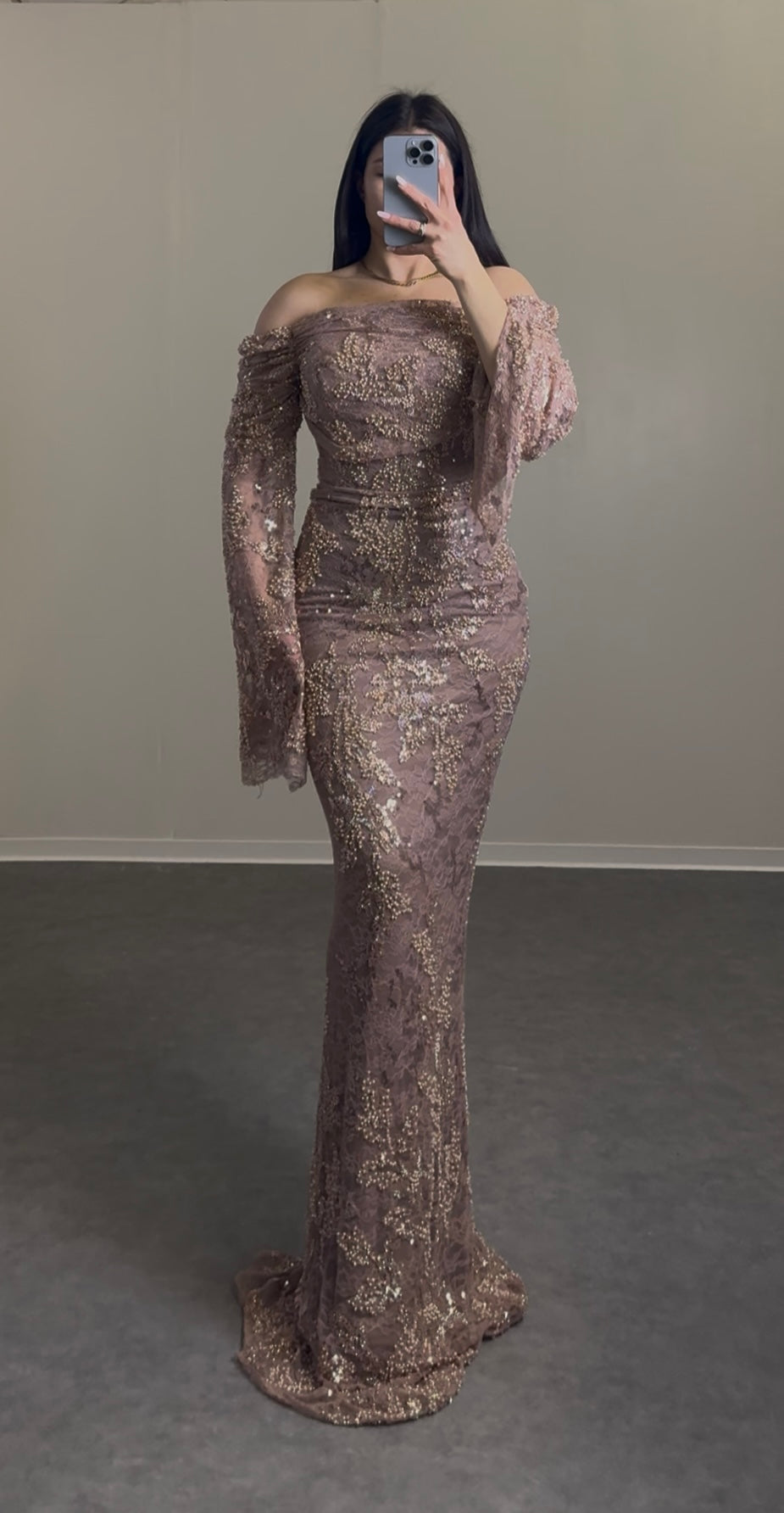 Off-Shoulder Maxikleid mit Spitze- und Perlendetails